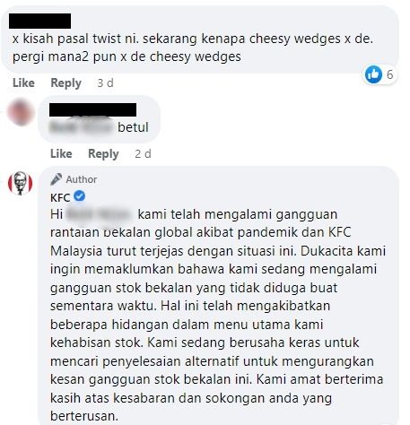 对此,KFC小编则回应,他们面对了冠病疫情导致的全球供应链中断问题,导致货物供应也受到影响。