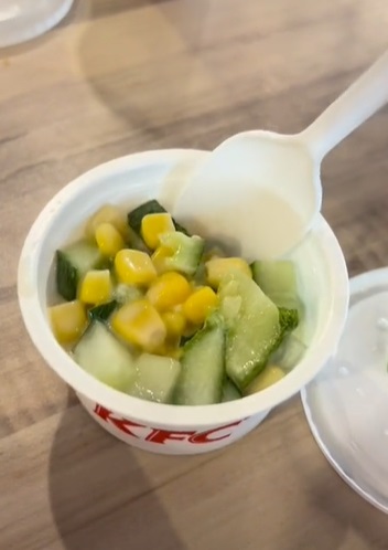 KFC最近用配美奶滋的黄瓜玉米沙拉取代原本的包菜沙拉,反应褒贬不一。(截图自视频/@ezhrjmn)