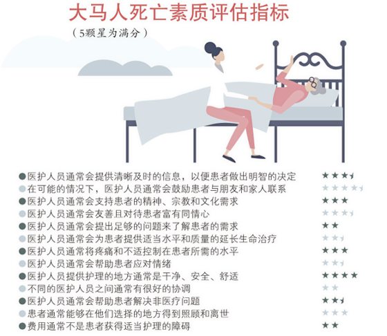 新加坡国立大学医院每5年都会做一项名为“专家评估死亡素质的跨国比较”调查,综合收入、区域、人文发展指数、人均寿命、死亡人数及医疗开支各方面指数来评估各国的死亡素质。