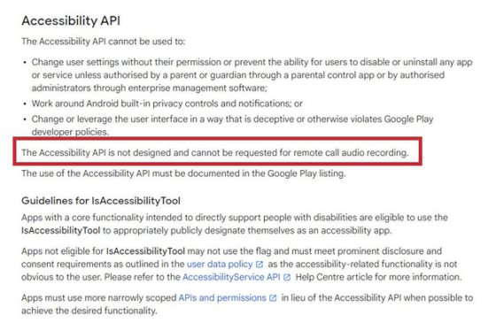 不料,开发者还是成功找到“漏洞”,通过安卓的“辅助功能API”(Accessibility API)去开发应用。谷歌得知后也不给任何机会,决定全面封杀。谷歌指出,“辅助功能API”不是专为远程通话录音而设,开发者不能利用这个API通话录音。