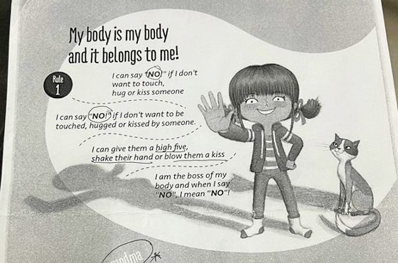 这是我的身体,是属于我的!我可以说“不!”,如果我不想摸、抱或亲某个人。我可以和他们击掌,握手,或给他们一个飞吻。我的身体我做主,当我说“不”就是“不”!