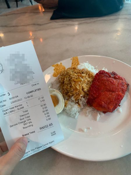 根据收据,炸鸡及淋上咖哩汁的白饭,再加上半颗咸蛋的价格是27令吉30仙;至于柠檬水则是3令吉50仙。