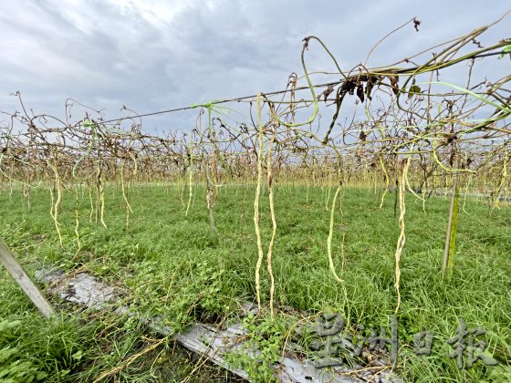 彭敬咏的农友陈伟强也在,他种植不同品种的羊角豆都长得漂亮,还能继续采收。沿路边走边谈,这片长豆收成了还没打理,那片棚子下长满野草也是还没整地。不只陈伟强,还有很多农友都面临同样的问题,人力缺乏没人整地,就无法耕种。后续的收成、市场供应、菜价等等连锁影响,可想而知。