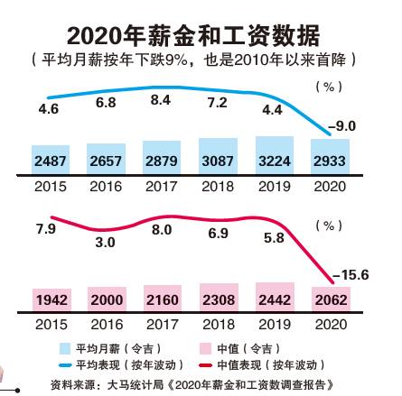 值得一提是,马来西亚统计局早前发布的2020年薪金和工资调查报告显示,国人2020年平均月薪下降了9%,从2019年的3224令吉滑落至2933令吉;这也是2010年以来首降。