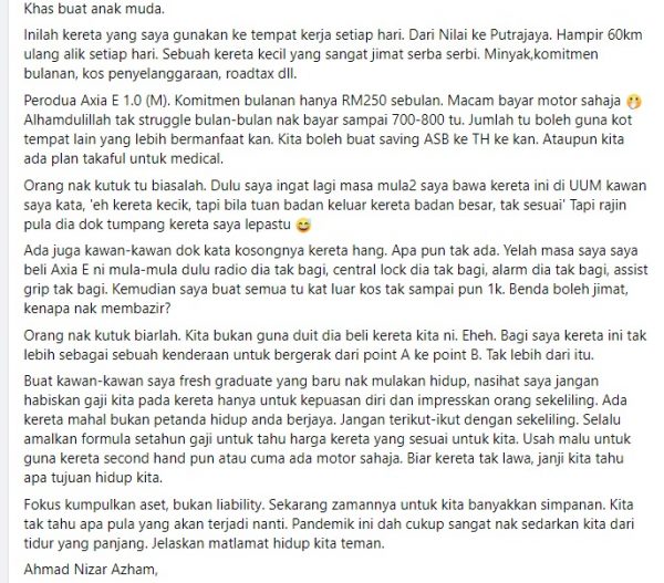 时下不少年轻人都追求,一名从事教育的男子阿曼尼查之前的一则帖文再次在马来社媒流传与讨论,籍以鼓励年轻人别因为面子而让自己活得太辛苦。