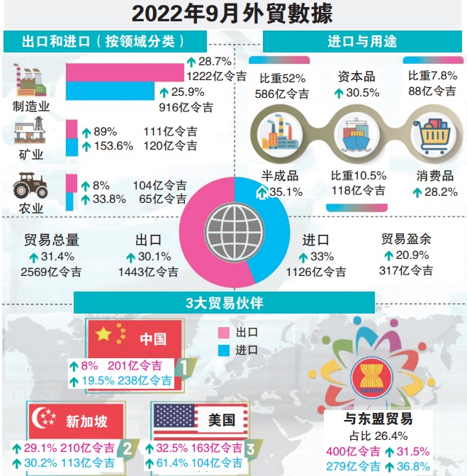 在贸易伙伴方面,9月与东盟的贸易占贸易总额的26.4%,按年增长33.6%至678亿5000万令吉。至东盟的出口增长31.5%至399亿7000万令吉,而进口则大增36.8%至278亿9000万令吉。