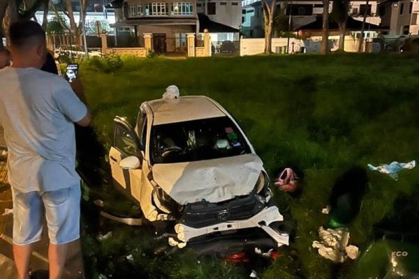 这起车祸于今日凌晨2时许发生在浮罗池滑区,女子疑从十字路口转弯时失控而越过了路边的人行道,再撞倒路边的锌板围墙并冲入草场后才停下。