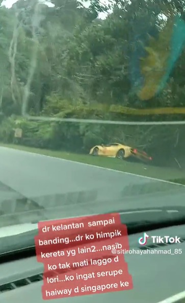 另一名网民@melhaiqal在视频写道,她从槟城回吉隆坡的路上遇见邻国的法拉利车队发生意外,黄色的法拉利相信是为了闪避路洞,而失控撞进路肩草丛。