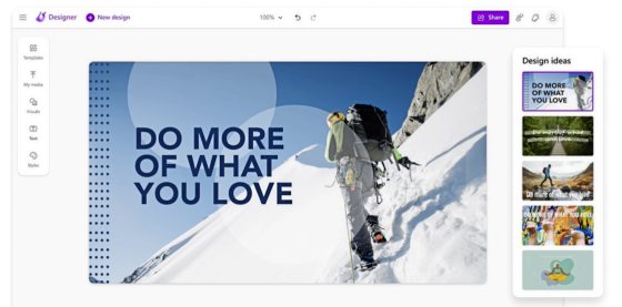 微软会提供两种版本,一个是免费版,另一个是进阶版,供Microsoft 365 Personal和Microsoft 365 Family订阅用户使用。这款软件可以直接在网上即开即用,不用下载到电脑或手机上面。根据官网资料显示,它拥有超过1亿张照片和视频的图库。同时,可以迅速将设计作品上传到社交媒体或传送到手机。