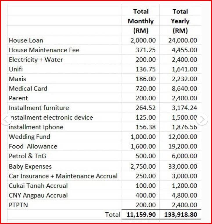 根据男子的分享,他每个月的家庭开销约1万1159令吉,而每年则需花费13万3918令吉。