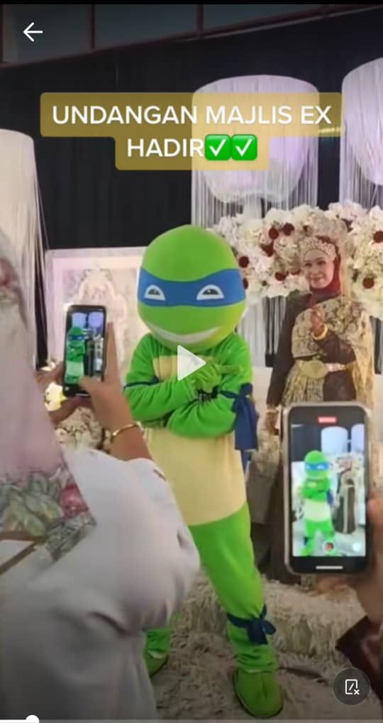 (八打灵再也8日讯)女友结婚了,新郎不是我。相恋8年的女友嫁他人,一名马来男子装扮成“忍者龟”,出席前女友的婚礼献祝福。