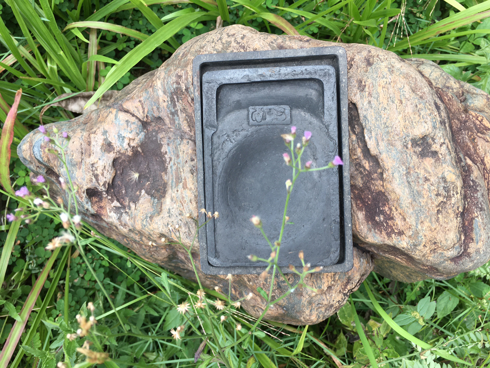 多年前,阿嬷以百岁嵩龄归老后,小叔拎来一个藏着不少老好东西的迷你“甲毕”(潮语行李的意思)送我留念,令伪光头感激涕零。“甲毕”里头,藏有一册颇为残旧的毛笔手抄中医药方谱子,也不晓得是否出自阿公的手笔,但心里却隐隐觉得,这无疑是阿公的遗物,颇有纪念意义。除了药方谱子,阿嬷竟然还留下了一枚老旧的小墨砚;从砚台的外观来看,砚池微凹,边栏稍损,看来以前使用得过于频繁,兴许只是权作粗用的书写工具,或许还是阿公用过的砚台呢。可惜这方墨砚,乍看之下,材质甚为普通,关键在于:这可是家传的宝贝啊,可谓纪念先人的价值更甚于一切,非常难得,亦很可贵。古砚微凹聚墨香。酷爱舞文弄墨,附庸风雅的伪光头佬,对这方盈盈一握的小砚台可说是爱不释手,于是就留在身边相伴矣。