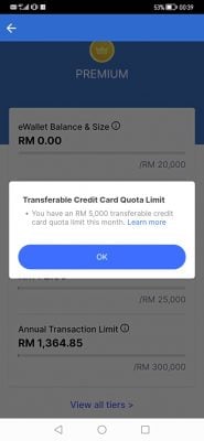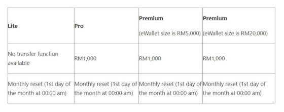 但是,用户每个月会有充值和提款的额度。以Premium用户为例,每个月的信用卡充值限额是5000令吉。用户以信用卡充值5500令吉以后,他可以提出5000令吉,剩下的500令吉则属于“不可转账”的款项,只能拿来消费。如今,TNG公司进一步下调信用卡充值限额,让用户无法随心刷信用卡套现。