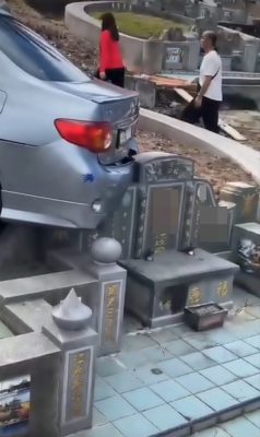 此事故在网络上流传,从视频看来,汽车后退时倒滑,车尾撞到坟墓,汽车尾部破损,一些网民对此议论纷纷。