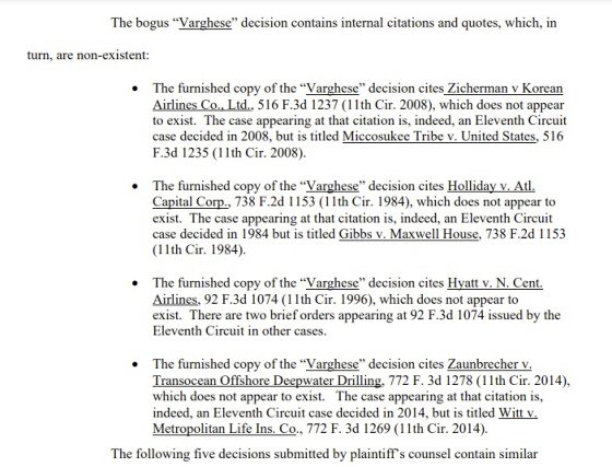 Steven Schwartz向法院提交了10页的案件摘要,里面引述超过6个相关的判例。然而,纽约南区联邦地区法院法官Kevin Castel后来发现,这6个判例竟然不存在,这意味着这些判例都是伪造的。