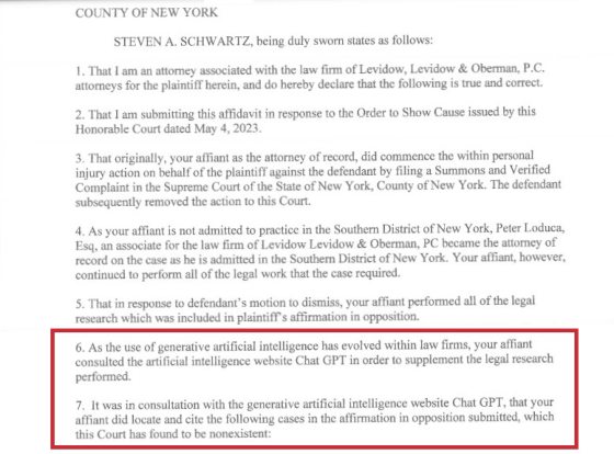 当事情揭发后,该名律师在5月24日发布一份宣誓书,承认自己用ChatGPT撰写法律文件。但是他强调从来没有用过ChatGPT,没有意识到其内容可能是假的。
