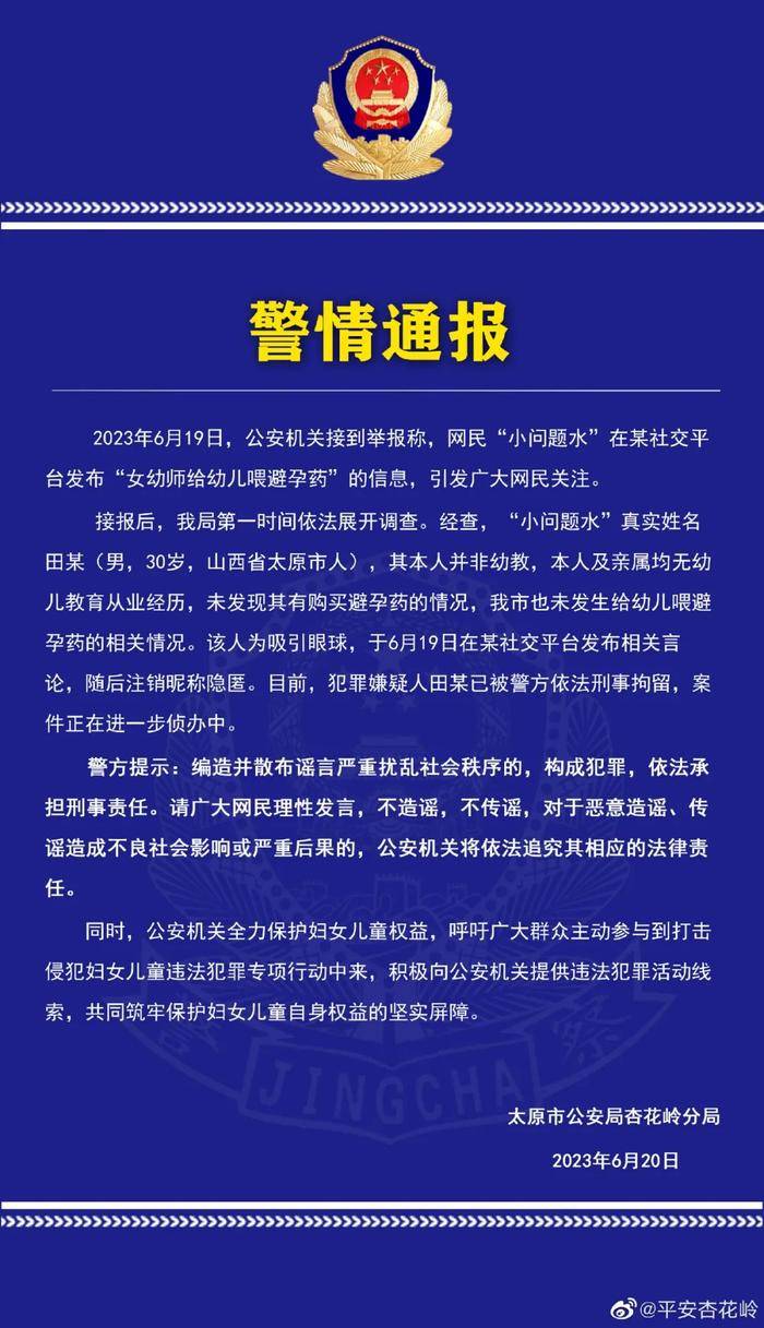 涉事的网络平台称,已经第一时间对用户进行了封号处理,并且已经报警,山西太原警方之后发布通报称,他们接警后,已经第一时间找到了发布谣言的男子,“小问题水”真实姓名是田某,今年30岁,其本人并非幼教。