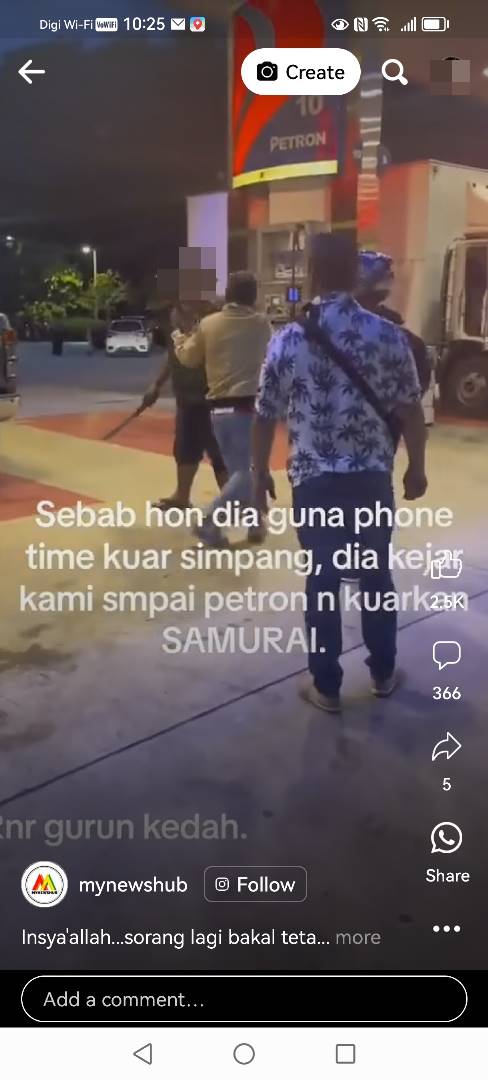 视频显示,嫌犯是在驶出路口时使用手机,所以被福特Ranger司机按喇叭,因为不满被按喇叭便一路追着福特Ranger去到油站,挥刀向对方渲泄不满,幸得旁人极力阻止劝架,否则后果不堪设想。