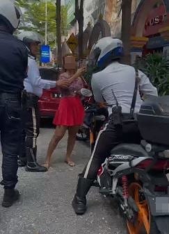 依据数段视频画面,可见一名身穿蓝色制服的警员在开罚单,身旁还有2名白衣制服的交警,女子不爽地向旁人谩骂警员,之后疑发现其中一名警员用手机拍摄她,女子相当激动地质问警员为何拍她,然后举起手机反拍。