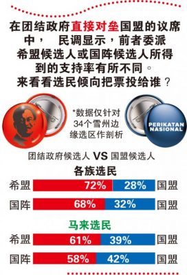若团结政府委派国阵候选人上阵,则预测可获得68%的各族受访者支持,国盟则获32%,“如果只看马来选民,投给国阵的支持率是58%,国盟则42%。”