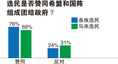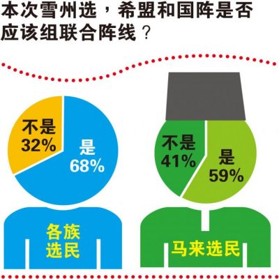 民调显示,68%的雪兰莪各族受访者认为希盟应该和国阵站在同一阵线,另32%表示不同意;至于马来选民则有59%表达赞同立场,另41%不同意。