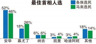 无论如何,仍有52%的各族受访者认为安华是目前的最佳首相人选,18%则把票投给国盟主席丹斯里慕尤丁,6%投前首相拿督斯里纳吉,3%投伊斯兰党主席丹斯里哈迪阿旺及3%投前卫生部长凯里。
