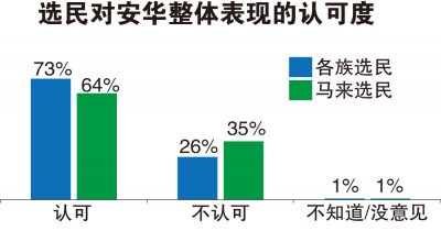 民调显示,高达73%的各族受访者认可安华的表现,只有26%持反对意见。若单看马来受访者的支持度,则有64%的人表示认可,另35%不认可,1%表示不知道或没意见。
