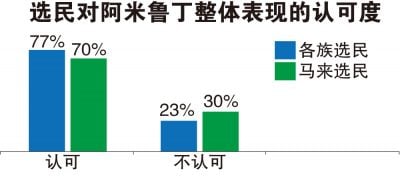 这5年来,看守州务大臣阿米鲁丁的“成绩”也不错,高达77%的各族受访者和70%的马来受访者认可他的整体领导表现,分别只有23和30%不认可。