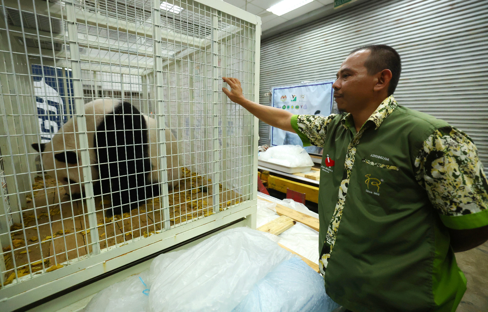 在吉隆坡国际机场货运中心卸下2只熊猫的过程中,46岁阿兹伦尼占不时呼唤谊谊和升谊,轻拍笼子安抚它们的情绪,确保熊猫保持镇静。