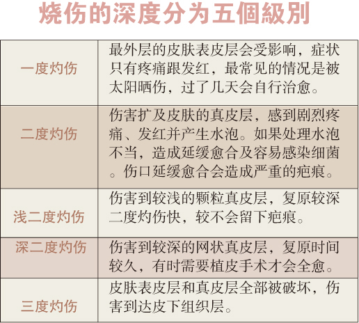 他强调,灼伤处不只是对皮肤会带来伤害,灼伤部位是手指、膝盖、脚踝、手肘、腋窝或关节部位更需注意,如果没有及时就医,日后可能会引致损伤神经、韧带的功能,影响该部位的伸展、活动及触觉能力。