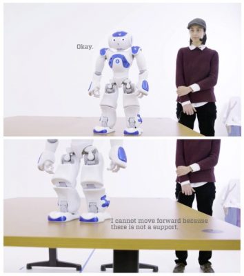 透过这系列的问题,机器人会自我评估、辨认指令者的身分,以及推断这个指令是否合理。如果它拒绝服从指令,还会提出合理的理由,而不是停止不动。