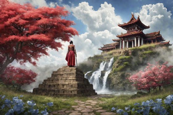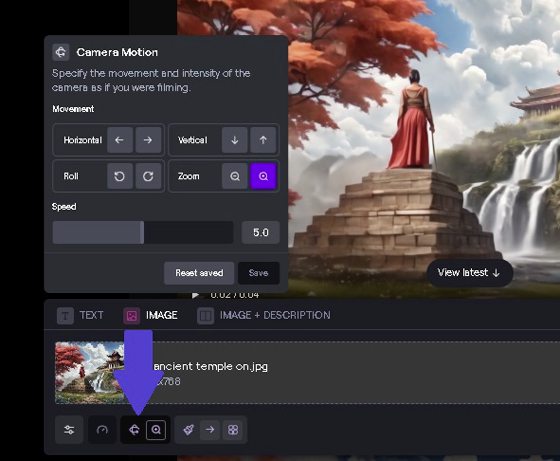我全程用Gen-2的“Generate image”生成了一张照片,文字指令描述有一位侠客仰视着山上的一座中式庙宇,背景多云和有一个瀑布。上传这张AI照片后,我点选“Motion Brush”,开始在云层、瀑布和花草上面涂抹,然后点击“Generate”,这些被涂抹的景物就会跟着动起来。