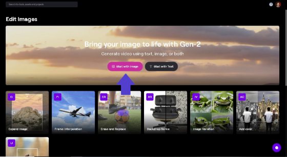 | 1. 打开Runway页面,选择“Start with image”。