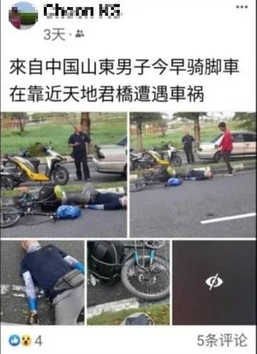 此外,有网友日前在脸书发布消息,指有一名来自中国山东的男子于上午在阿旺将军路天地君神庙附近骑脚车时遭遇车祸。