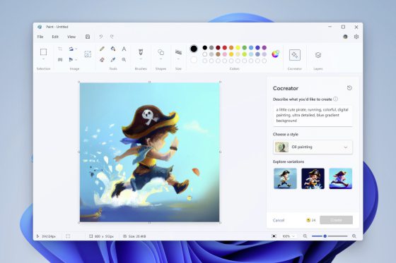 最近,推出了“”AI图像生成功能,让“Paint”通过OpenAI的DALL-E 3文生图模型去生成图像。首先打开“Paint”,在右上角会出现“Cocreator”的选项。点击之后,右边会出现一个文本框。输入照片指令,选择自己喜欢的图像风格,比如炭画、素描、水彩、油画、卡通、像素、数码画等等,然后耐心等待“Cocreator”生成照片。