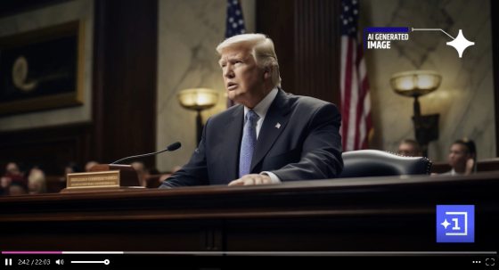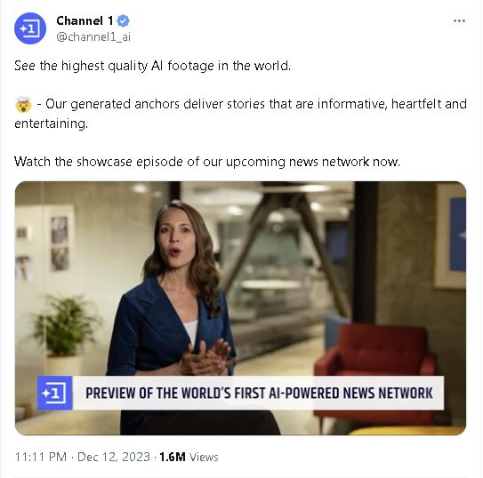在12月12日,“Channel 1”率先在社交平台X上传了一个宣传视频。为了确保观众能分辨真假新闻画面,在视频中,所有AI生成的照片和视频在右上角会有明显标识。更重要的是,“Channel 1”强调不会制造假新闻,他们不会用AI去捏造一个未曾发生过的事。