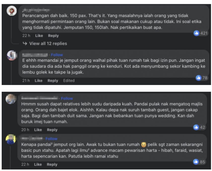 网民纷纷抨击亲友的自私和不懂得尊重新人行为。(截图自脸书)