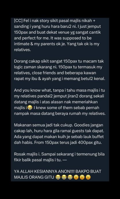 一名女子以匿名方式吐露心声,指她的亲戚为了让她的婚礼显得有声有色,在没有经过她的同意下,帮她邀请她的邻居前来参加,最后搞到宴会上的食物不够吃,原本的大喜之日最后被亲戚搞到她颜面扫地。