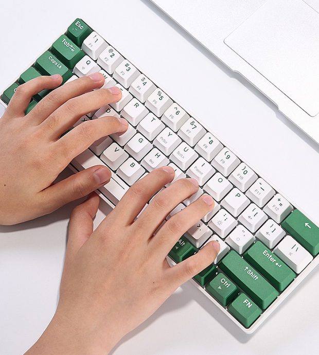 键盘配列68键,净重只有620克,采用樱桃轴体,主打商务便携。键帽使用高含量PBT双色成型工艺,字符不易磨损,轴体下的钢板使用纯铝金属材质,也通过有阳极氧化喷砂处理。