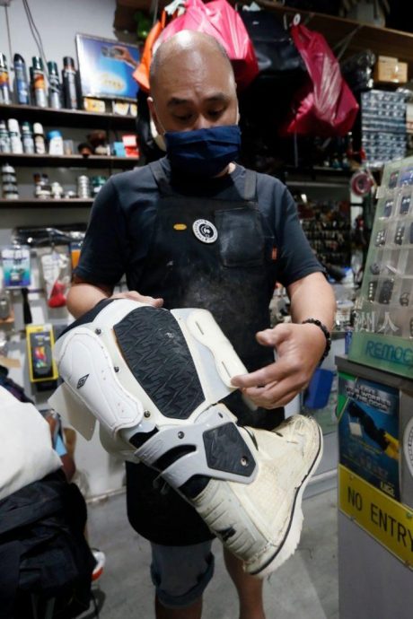 除了几双等待修复的鞋子以外,修鞋店后方架子上,摆满许多装进袋子内的鞋子。由于行管令的关系,顾客没法前来试穿和领取鞋子,许多修好的鞋子只能继续存放在店里,有的更放置长达两三个月。