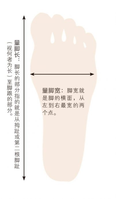 建议准备一张纸、笔和尺,赤脚踩在纸上,画出脚的轮廓,所得到最宽与最长的两端点,即是脚长与脚宽标准测量值;又或者使用量尺,脚长的部分是从拇趾或第二根脚趾(视何者为长)至跟部,脚宽就是脚的横面,从左到右最宽的两个点。