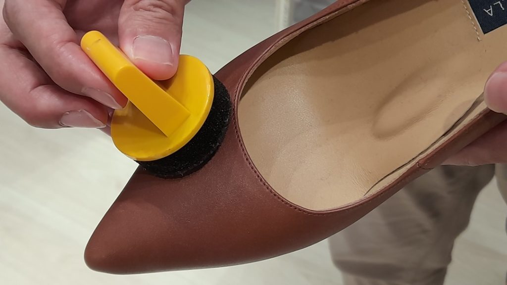 颜瑞嘉建议每隔一到两个星期,可以自己给鞋子保养,用软布沾取少量鞋油,薄薄一层涂过高跟鞋,鞋底连接处等细部也要仔细涂过一遍,再用小毛巾或软布把鞋面擦亮的同时,也能抹去多余的鞋油。