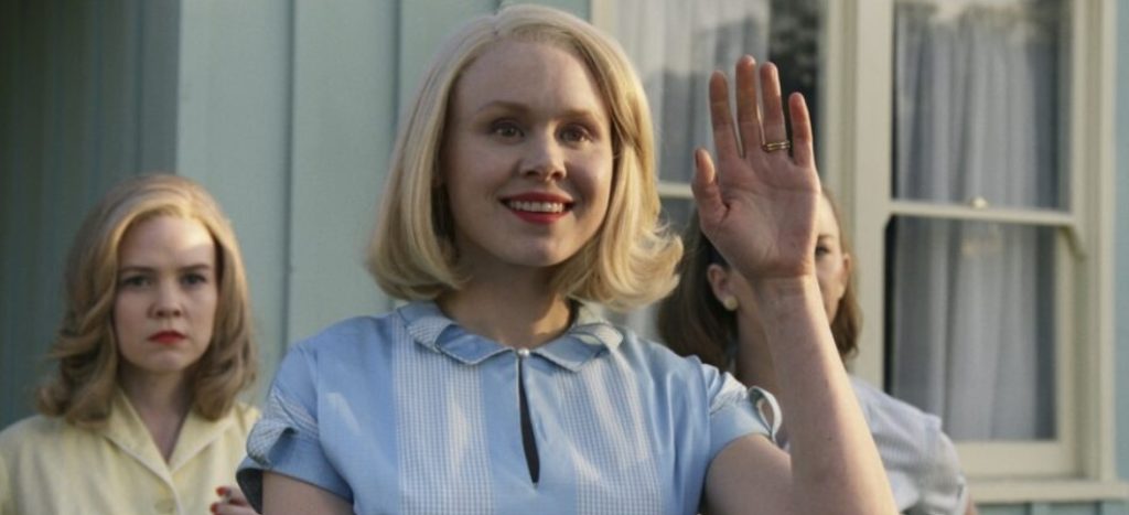 此剧还有一个角色,也被塑造得极其怪异。她就是Betty(Alison Pill饰演)。Betty是个拥有完美人设的妻子,却同时也是掌控欲和野心非常强烈的女人。她渴望拥有男人的权力,潜意识内却没有女人当家做主的念头,而只乐于做个精致的洋娃娃。她喜怒不形于色,后段更趋向病态。性格偏执之余,那种被训练过的常保微笑的姿态无不让人倒抽一口凉气。Alison Pill的眼神深邃,再配上鲜血色的口红,为这个角色增添了大量神秘感。最后被怒火和欲望掌控的她,结局让人不胜唏嘘。Alison Pill在角色的揣摩和层次掌握方面,有着上乘的表现。