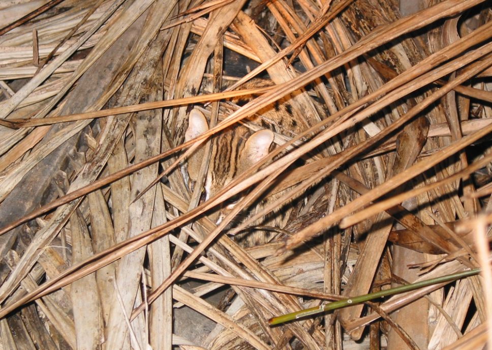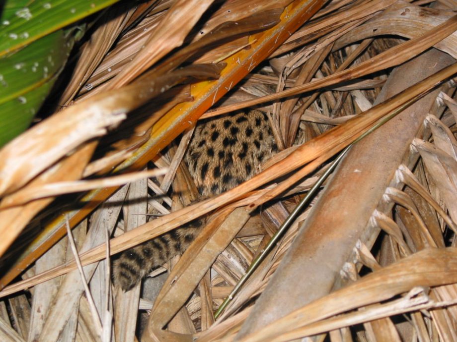 待我跟上时,大家已经把山猫团团围住,在旁观看。而在人群之中的那只山猫,其实并没有真正躲进油棕的落叶堆下,倒像是传言中埋头的鸵鸟那样,只把头部和上半身给藏了起来,后半身仍曝露在外。过了一会儿待人们渐渐散去,它才转过身来穿过油棕的落叶缝隙,窥探我们这些可怕的人。