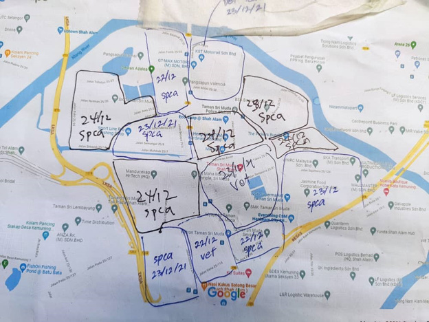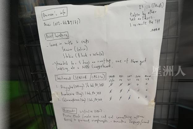 “除了在流动诊所执勤,我们也会根据划分的区域到住宅区诊治动物。在第5天的时候已经涵盖了整个区域。部分饲主知道我们提供义诊后,已经带着宠物去到流动诊所治疗,但一些饲主则无暇或没有交通可以去到诊所,所以我们就带上药物、食物上门诊断,如果情况太糟糕的,我们就带出来,交给附近的兽医医治。”