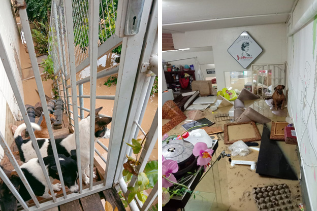“在我们忙着抢救东西时,又听到狗在叫,这次前门的狗直接顺着水势游进屋子,爬到较高的家具避难,但因为水不断涌进来,它不断滑倒又再爬上去,非常狼狈!