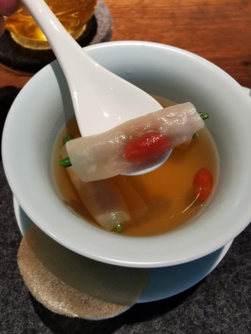 他们把习得的日规分切概念,活用在“椰汁香芋滑鸡煲”这道菜上,传统做法是鸡肉与芋头煲煮,香归香,不过汤头浊稠。他们则单取鸡翅关节处,去除骨头,将原本的空洞塞入条状芋头,这样同样能享受这道汤品的美味,却少了卖相欠佳与汤头浊稠的缺点。