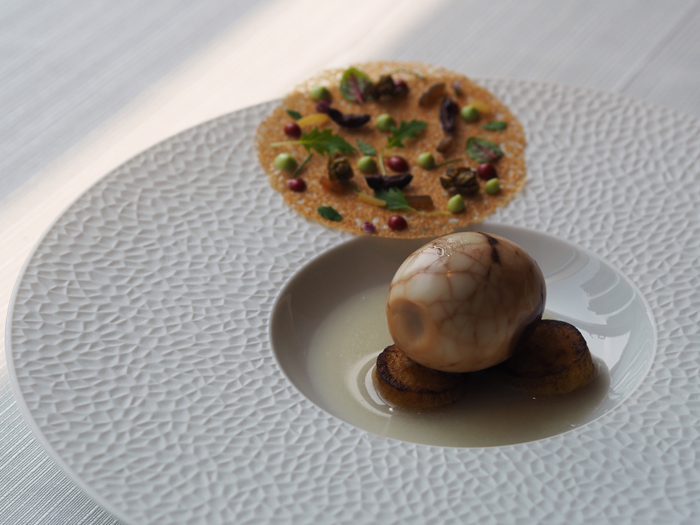 这溏心乌鱼子就是厨师取得生鱼卵,自行熟成制作,切开来带柑橘色泽与通透感,口感如日式羊羹或法式软糖,咸度只有传统版本的1/3、气味干净优雅,单吃也没问题,以橙酒取代高粱酒去腥增香,跟朋友分享时,众人惊艳。