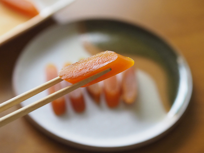 之所以加这些配料或变化,其实就是为了中和乌鱼子过咸、过干的问题。若能从源头就改变的话,便能创造更多的可能,咸度、软硬度、色泽都能自行决定。就像咖啡店与自烘店的差别,咖啡店只能挑选咖啡熟豆,自烘店拥有从生豆到熟豆的掌控权,鲜度、烘焙点、数量等都能自由运用。