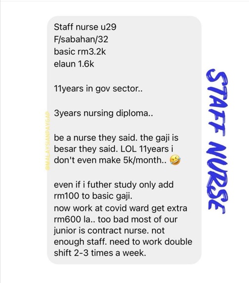 一名在政府机构工作了11年的护士分享,每月薪资不到5000令吉。读过3年护士文凭的她表示,即便自己再去深造,也只获得多100令吉的底薪而已。由于人手不足,她很多的学弟妹都是合约护士,工作量庞大。